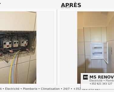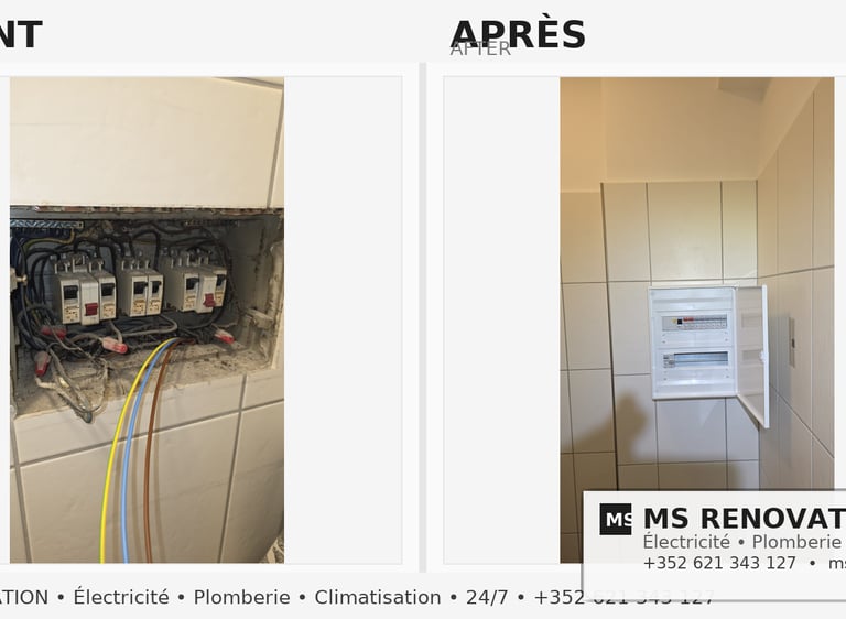 Pour un dépannage électricité à Schifflange, MS Renovation privilégie un contact simple et rapide. Vous pouvez nous appeler pour expliquer la situation, mais aussi nous envoyer directement sur WhatsApp des photos du tableau électrique, des prises ou de la zone concernée, accompagnées de quelques détails sur le problème (panne de courant, disjoncteur qui saute, odeur de brûlé, prise qui ne fonctionne plus, etc.). Cela permet d’avoir un premier avis à distance et de mieux préparer l’intervention sur place, que ce soit dans un appartement, une maison ou un petit commerce à Schifflange et dans les environs. Pour gagner du temps, vous pouvez envoyer vos photos et explications directement sur WhatsApp au +352 27 58 58 25.